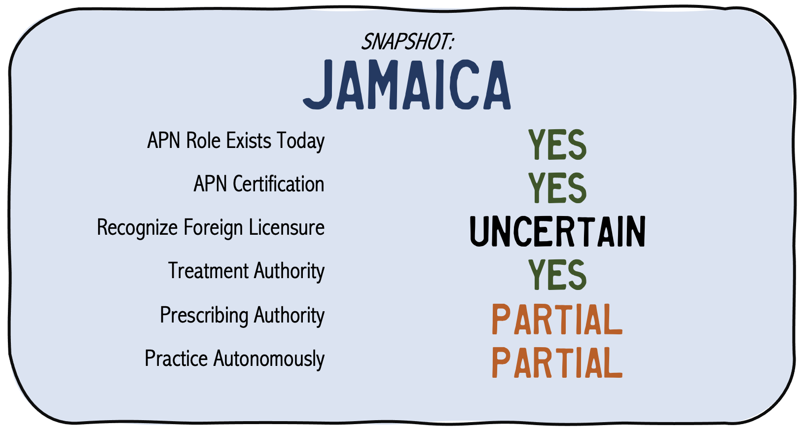 The role of the Advanced Practice Nurse (APN) was introduced in Jamaica in the 1970s largely driven by the lack of physicians in the country (NP / APN Network, 2022, p. 5, Zug et al, 2016). There are two main roles, identified as a Family Nurse Practitioner and Nurse Anesthetist.